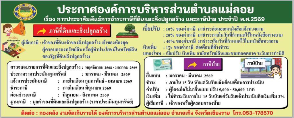 เรื่อง ประชาสัมพันธ์การชำระภาษีที่ดินและสิ่งปลูกสร้าง และภาษีป้าย ประจำปี พ.ศ. 2569