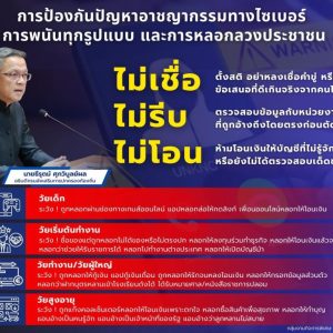 หรือสื่อสังคมออนไลน์อื่นๆ หลอกลวงประชาชนในรูปแบบต่าง ๆ อาทิ การหลอกให้โอนเงิน การแอบอ้างเป็นเจ้าหน้าที่รัฐ