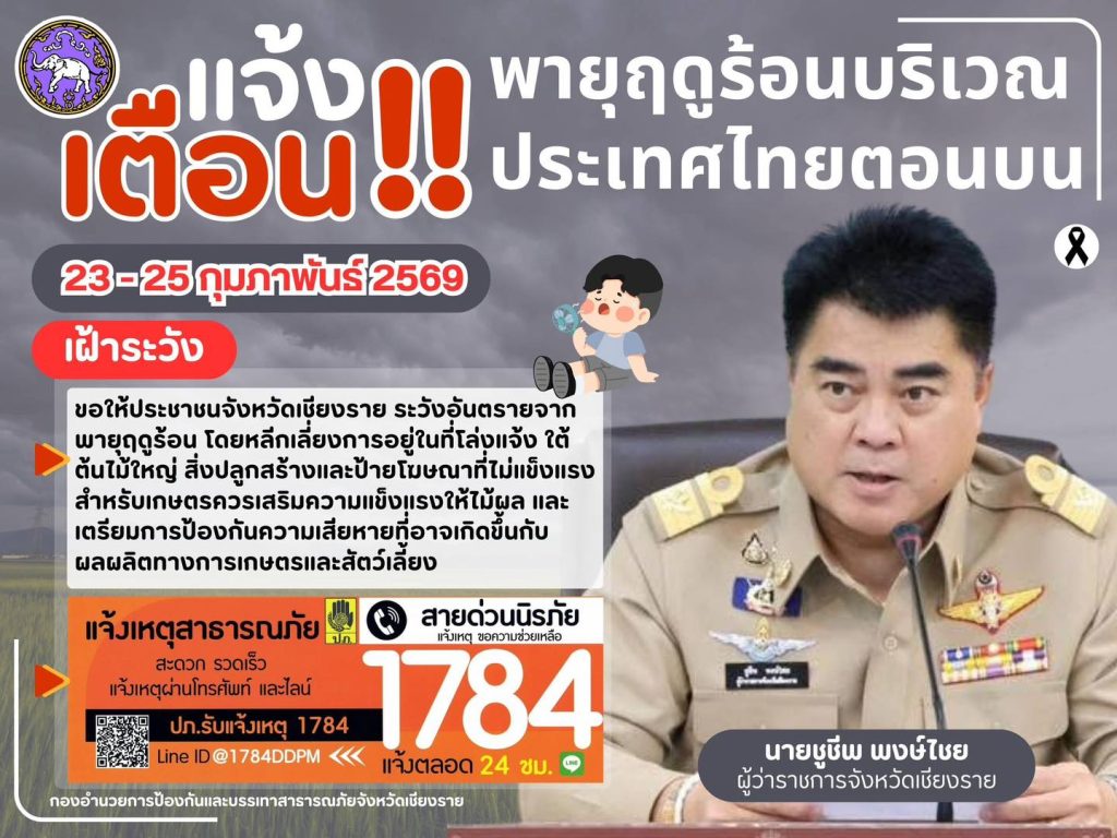 แจ้งเตือน พายุฤดูร้อนบริเวณประเทศไทยตอนบน ระหว่างวันที่ 23-25 กุมภาพันธ์ 2569
